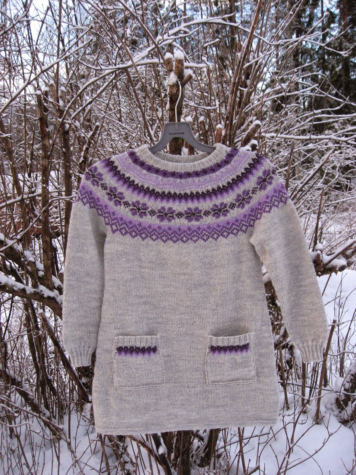 Denne tunikan har jeg strikket før i fargene fra oppskriften. Nå valgte jeg og strikke i lilla farger.